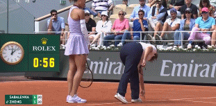 裁判亲自来到场边,最终维持原判,但转播方给出的鹰眼显示,萨巴伦卡回球出界了。最终郑钦文仍然拿下了这一局,但抢七输掉了首盘。